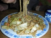 ◆人気メニュー ちゃんぽんおにぎり。人気メニューのちゃんぽんを注文するひとが 多い。大きな暖簾が目印。