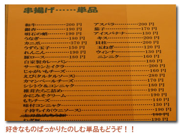 さんご塩を使用した和風テイストの串カツ屋。 天満市場から仕入れた食材はどれもコレもかなり美味しく、自家製のポン酢とソースをつけて一度食べれば、もう止まりません。